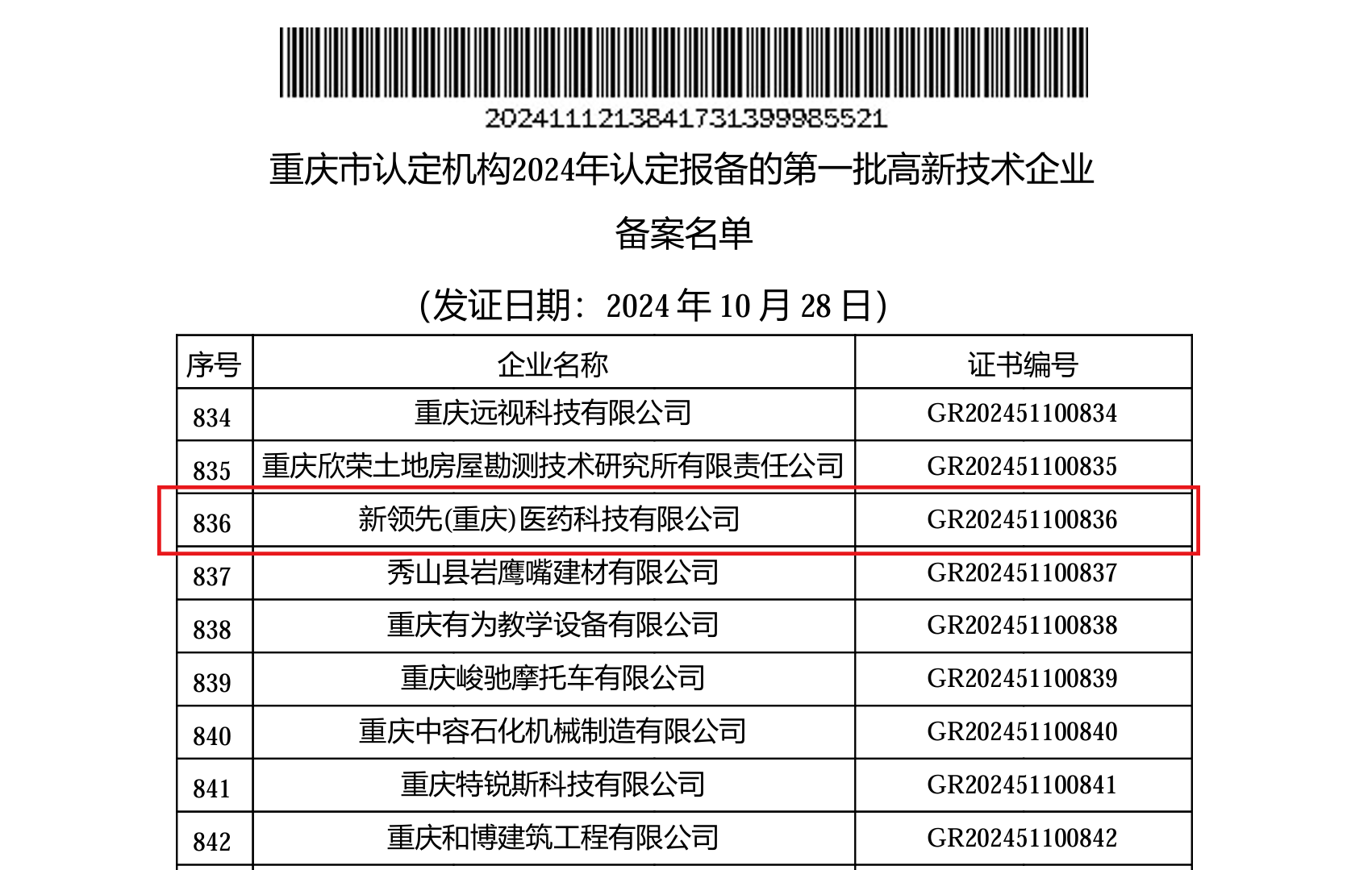 喜報(bào) | 新領(lǐng)先(重慶)醫(yī)藥科技通過國(guó)家“高新技術(shù)企業(yè)”認(rèn)定