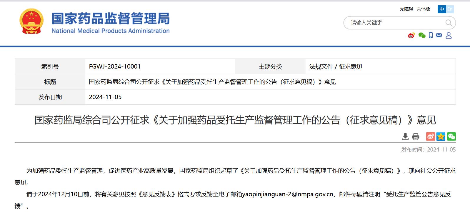 國(guó)家藥監(jiān)局綜合司公開(kāi)征求《關(guān)于加強(qiáng)藥品受托生產(chǎn)監(jiān)督管理工作的公告(征求意見(jiàn)稿)》意見(jiàn)