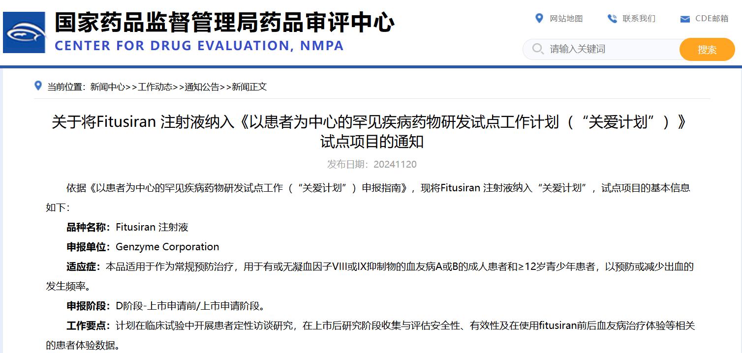 關(guān)于將Fitusiran 注射液納入《以患者為中心的罕見疾病藥物研發(fā)試點(diǎn)工作計(jì)劃(“關(guān)愛計(jì)劃”)》試點(diǎn)項(xiàng)目的通知