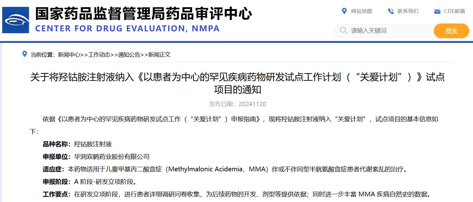 關(guān)于將羥鈷胺注射液納入《以患者為中心的罕見疾病藥物研發(fā)試點(diǎn)工作計(jì)劃(“關(guān)愛計(jì)劃”)》試點(diǎn)項(xiàng)目的通知