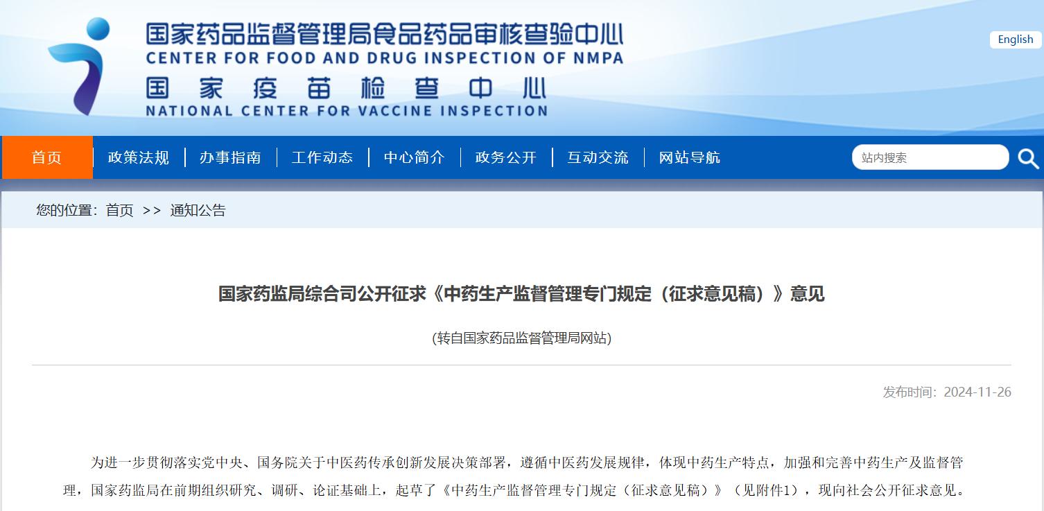 國家藥監(jiān)局綜合司公開征求《中藥生產監(jiān)督管理專門規(guī)定(征求意見稿)》意見