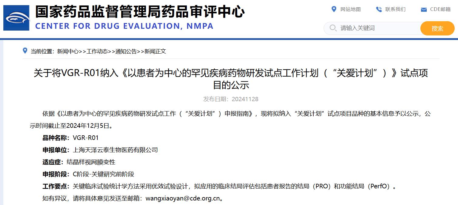關于將VGR-R01納入《以患者為中心的罕見疾病藥物研發(fā)試點工作計劃(“關愛計劃”)》試點項目的公示