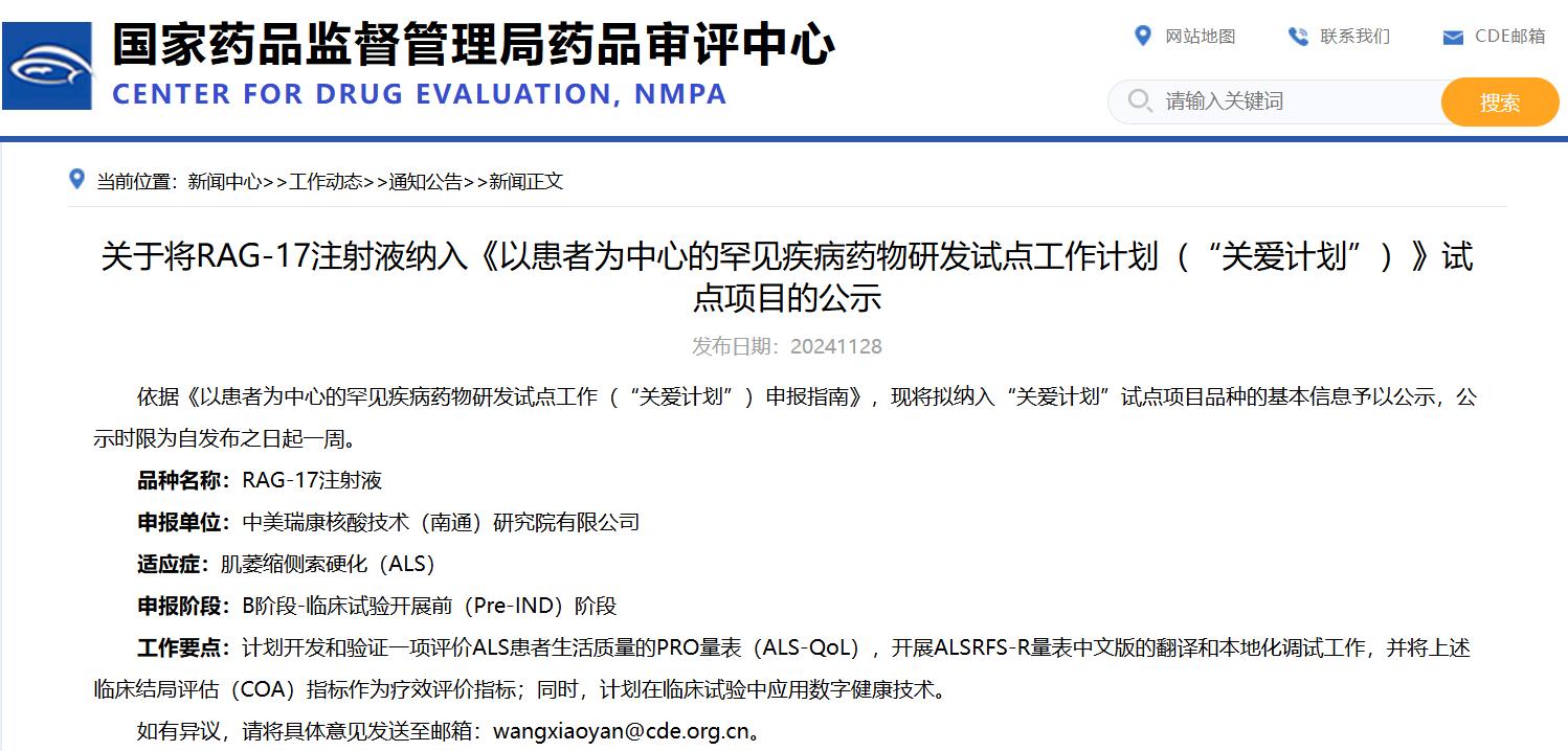 關于將RAG-17注射液納入《以患者為中心的罕見疾病藥物研發(fā)試點工作計劃(“關愛計劃”)》試點項目的公示