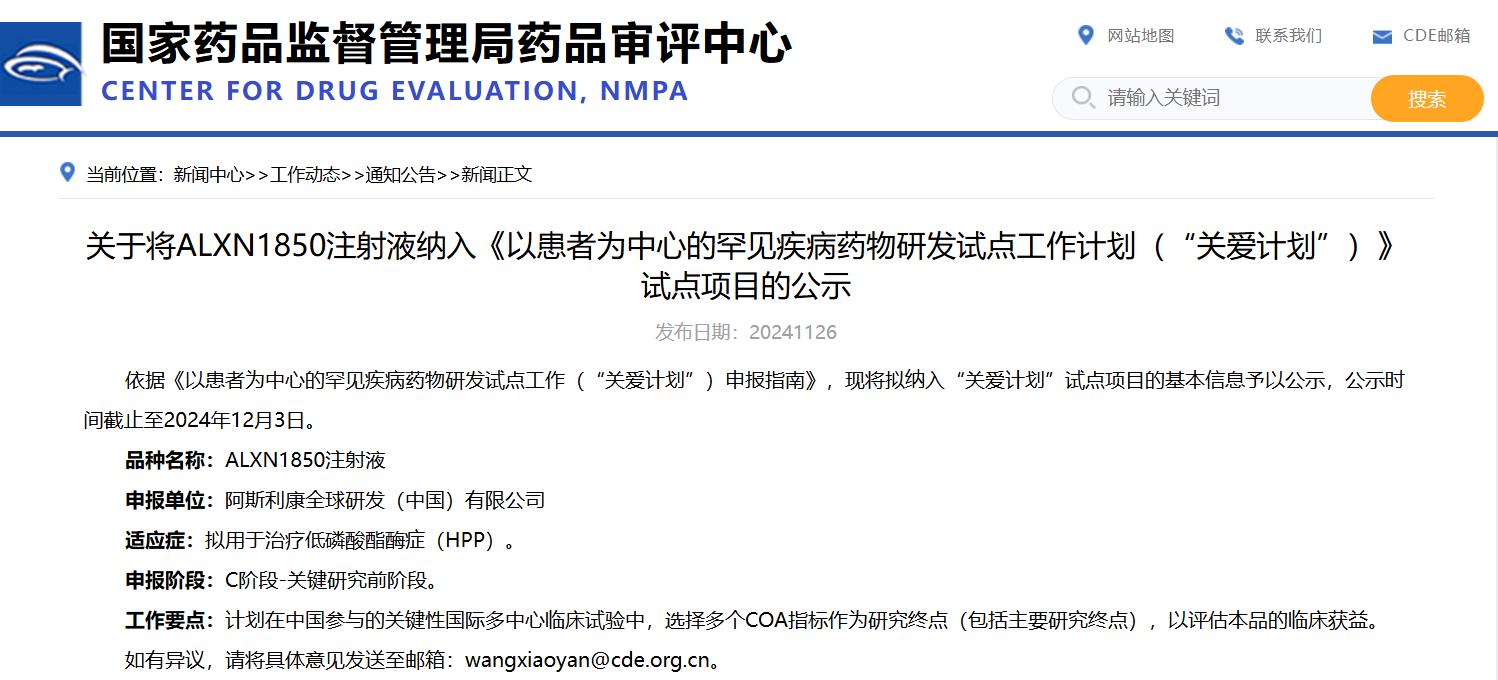 關于將ALXN1850注射液納入《以患者為中心的罕見疾病藥物研發(fā)試點工作計劃(“關愛計劃”)》試點項目的公示