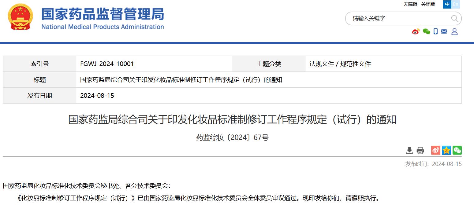 國家藥監(jiān)局綜合司關于印發(fā)化妝品標準制修訂工作程序規(guī)定(試行)的通知