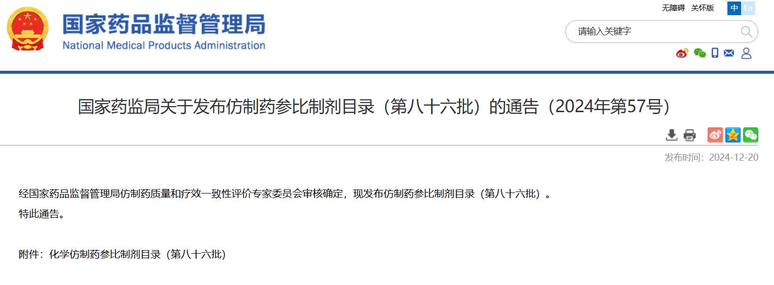 國家藥監(jiān)局關(guān)于發(fā)布仿制藥參比制劑目錄(第八十六批)的通告(2024年第57號)