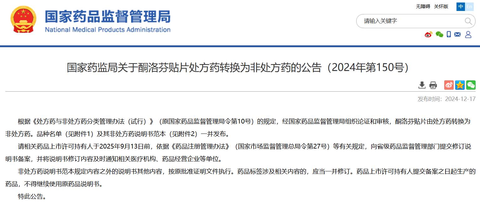 國家藥監(jiān)局關(guān)于酮洛芬貼片處方藥轉(zhuǎn)換為非處方藥的公告(2024年第150號)