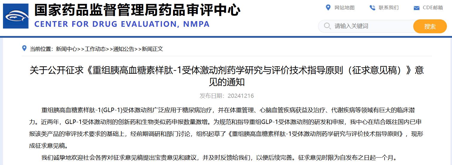 關(guān)于公開征求《重組胰高血糖素樣肽-1受體激動劑藥學(xué)研究與評價技術(shù)指導(dǎo)原則(征求意見稿)》意見的通知
