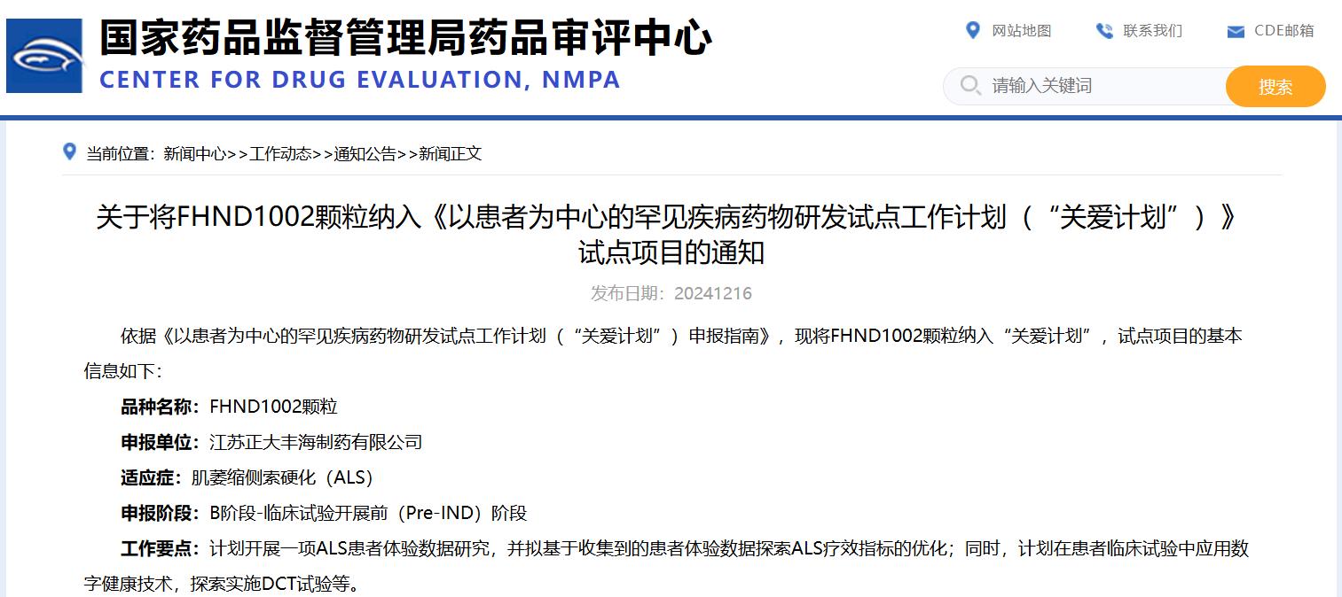 關(guān)于將FHND1002顆粒納入《以患者為中心的罕見疾病藥物研發(fā)試點工作計劃(“關(guān)愛計劃”)》試點項目的通知