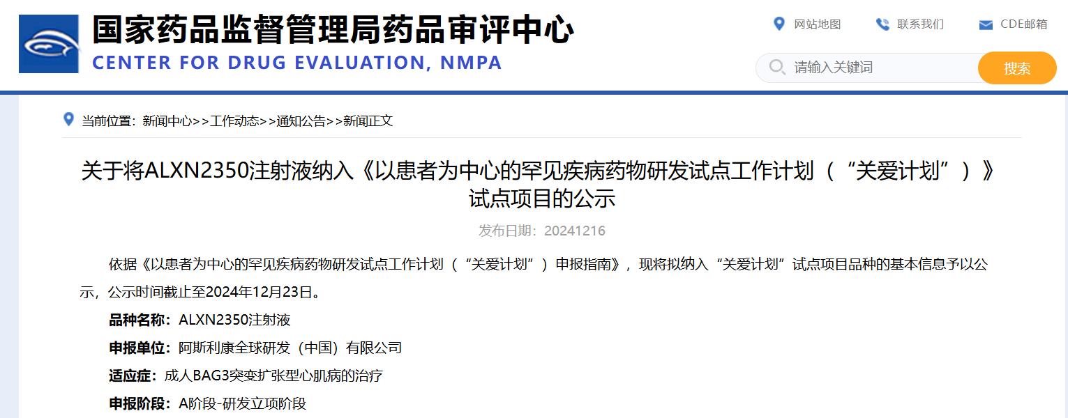 關(guān)于將ALXN2350注射液納入《以患者為中心的罕見疾病藥物研發(fā)試點工作計劃(“關(guān)愛計劃”)》試點項目的公示