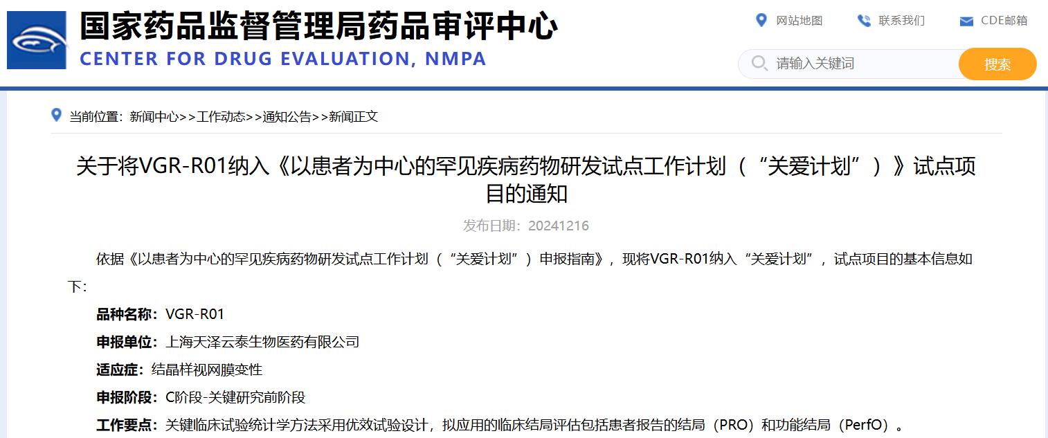 關(guān)于將VGR-R01納入《以患者為中心的罕見疾病藥物研發(fā)試點工作計劃(“關(guān)愛計劃”)》試點項目的通知