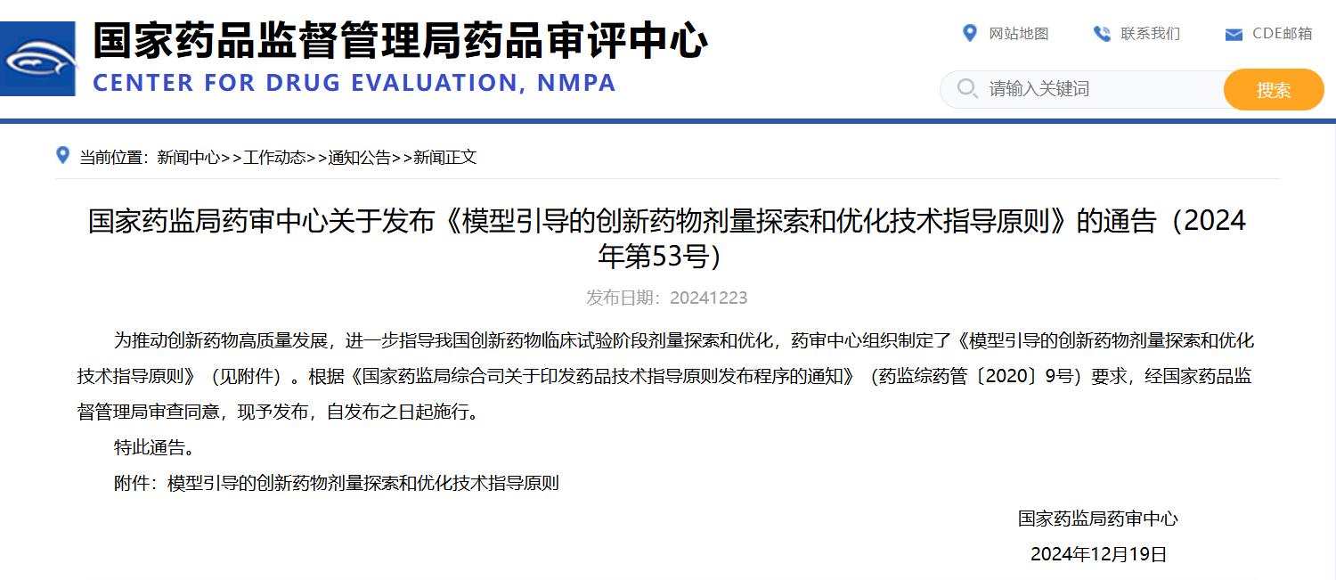國家藥監(jiān)局藥審中心關(guān)于發(fā)布《模型引導的創(chuàng)新藥物劑量探索和優(yōu)化技術(shù)指導原則》的通告(2024年第53號)