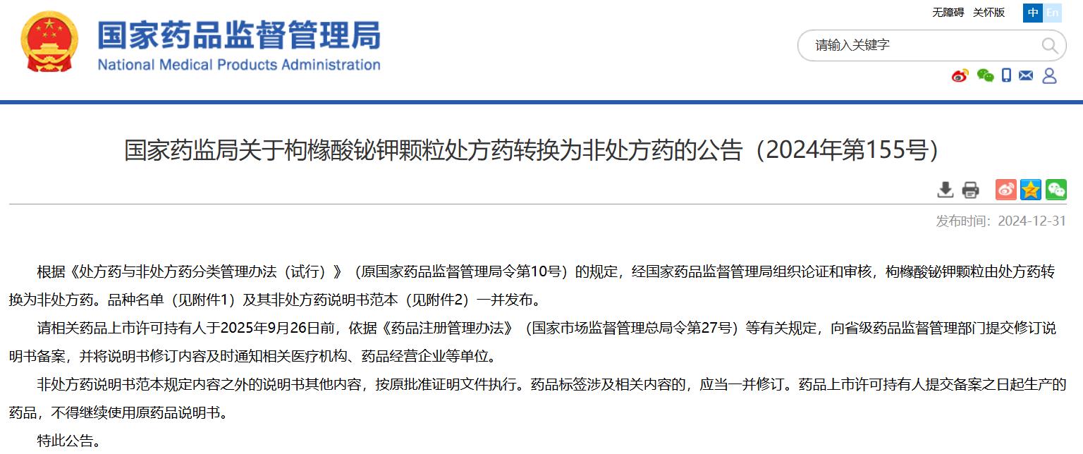 國家藥監(jiān)局關(guān)于枸櫞酸鉍鉀顆粒處方藥轉(zhuǎn)換為非處方藥的公告(2024年第155號)