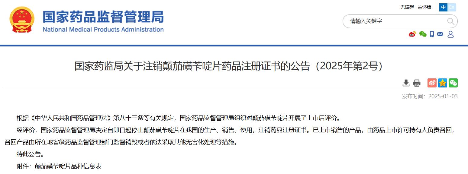 國家藥監(jiān)局關(guān)于注銷顛茄磺芐啶片藥品注冊證書的公告(2025年第2號)