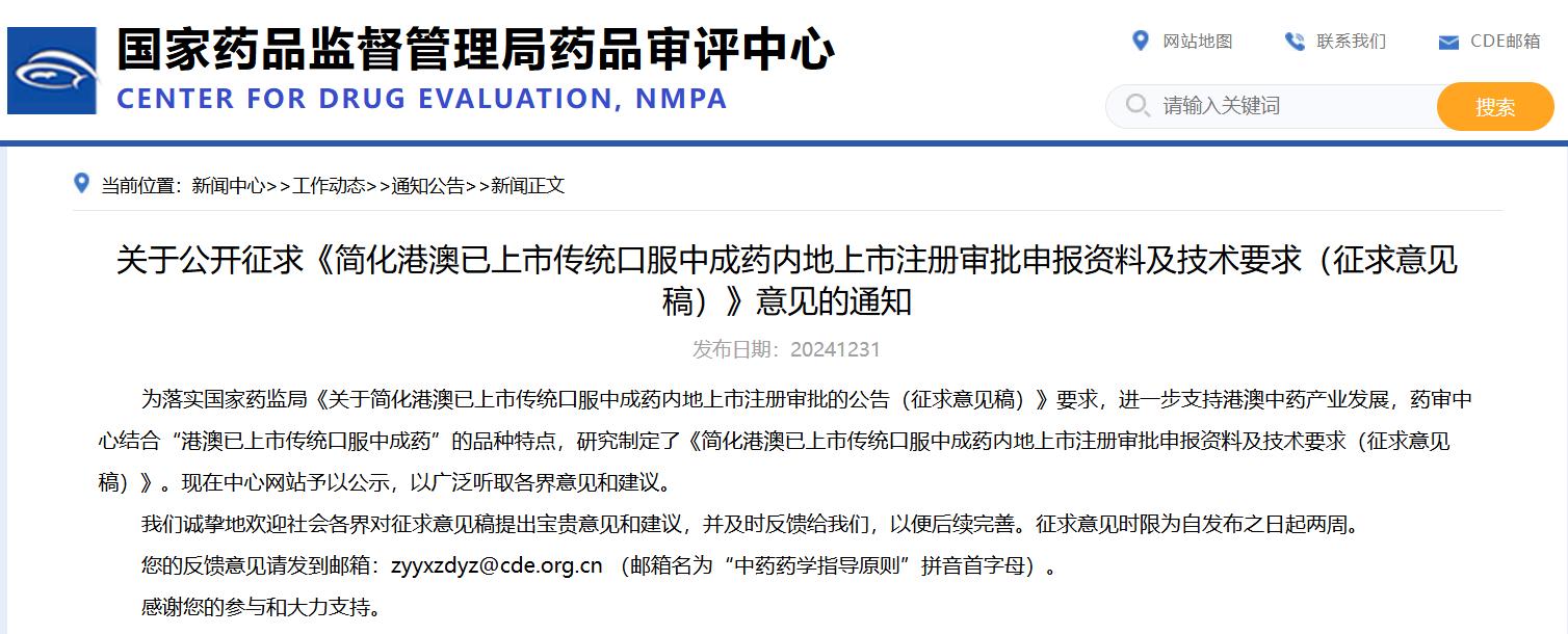 關(guān)于公開征求《簡化港澳已上市傳統(tǒng)口服中成藥內(nèi)地上市注冊審批申報資料及技術(shù)要求(征求意見稿)》意見的通知