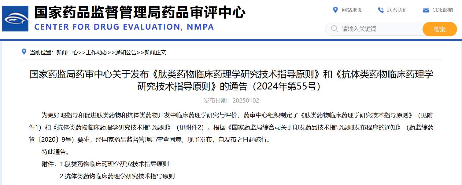 國家藥監(jiān)局藥審中心關(guān)于發(fā)布《肽類藥物臨床藥理學研究技術(shù)指導原則》和《抗體類藥物臨床藥理學研究技術(shù)指導原則》的通告(2024年第55號)