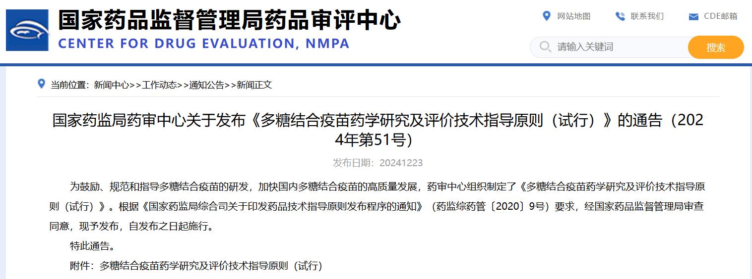 國家藥監(jiān)局藥審中心關(guān)于發(fā)布《多糖結(jié)合疫苗藥學研究及評價技術(shù)指導原則(試行)》的通告(2024年第51號)
