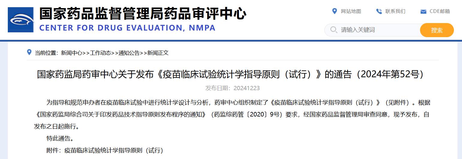 國家藥監(jiān)局藥審中心關(guān)于發(fā)布《疫苗臨床試驗統(tǒng)計學指導原則(試行)》的通告(2024年第52號)