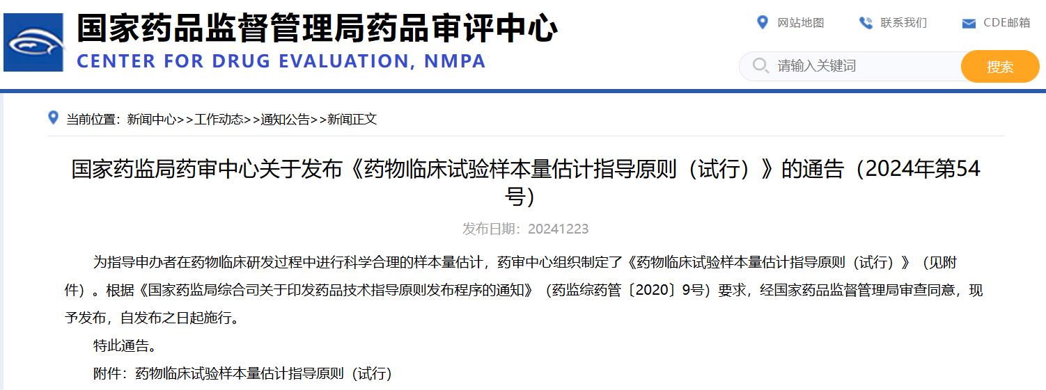 國家藥監(jiān)局藥審中心關(guān)于發(fā)布《藥物臨床試驗樣本量估計指導原則(試行)》的通告(2024年第54號)