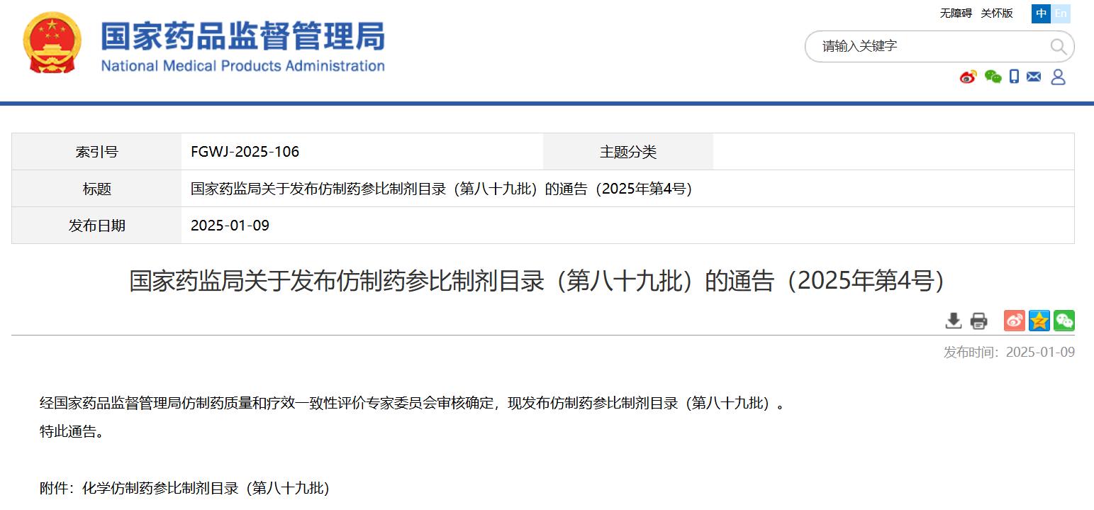 國家藥監(jiān)局關于發(fā)布仿制藥參比制劑目錄(第八十九批)的通告(2025年第4號)