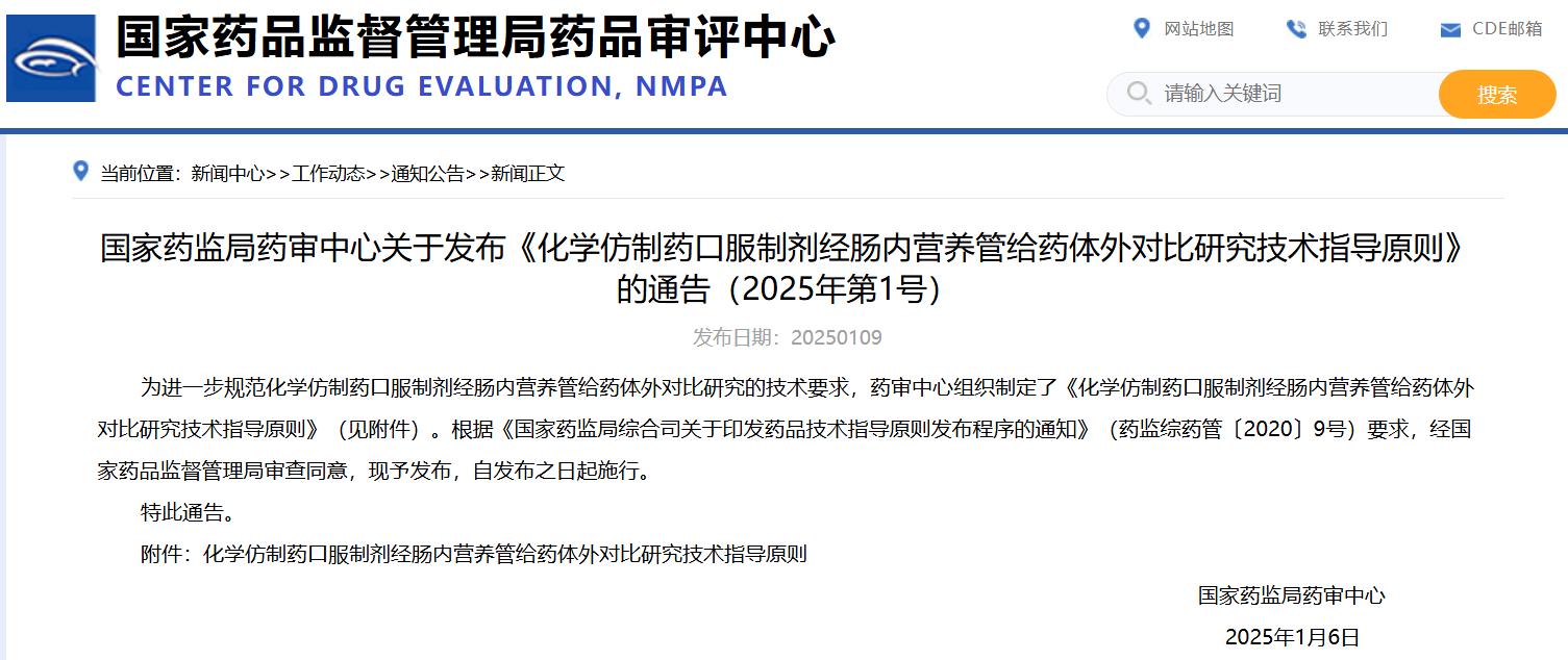 國家藥監(jiān)局藥審中心關于發(fā)布《化學仿制藥口服制劑經(jīng)腸內(nèi)營養(yǎng)管給藥體外對比研究技術(shù)指導原則》的通告(2025年第1號)