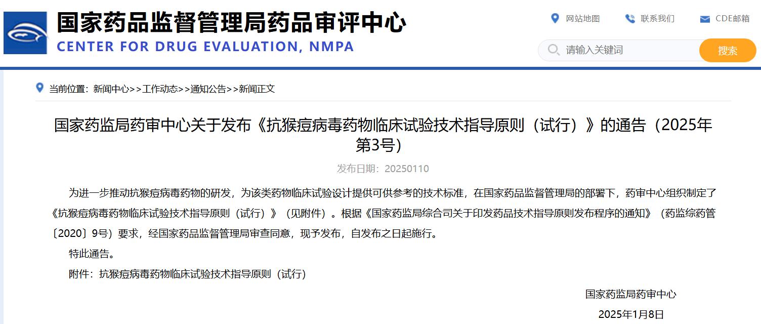 國家藥監(jiān)局藥審中心關于發(fā)布《抗猴痘病毒藥物臨床試驗技術(shù)指導原則(試行)》的通告(2025年第3號)