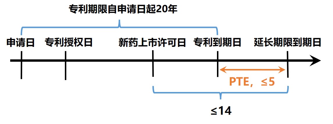 第三款中規(guī)定,為補(bǔ)償新藥上市審評(píng)審批占用的時(shí)間,對(duì)在中國(guó)獲得上市許可的新藥相關(guān)發(fā)明專利,國(guó)務(wù)院專利行政部門應(yīng)專利權(quán)人的請(qǐng)求給予專利權(quán)期限補(bǔ)償。補(bǔ)償期限不超過五年,新藥批準(zhǔn)上市后總有效專利權(quán)期限不超過十四年。