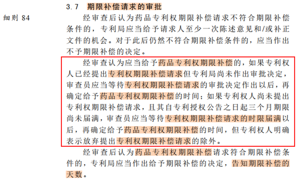 經(jīng)批準(zhǔn)認(rèn)為應(yīng)當(dāng)給予藥品專利權(quán)期限補(bǔ)償請(qǐng)求的,如果專利權(quán)人已經(jīng)提出專利權(quán)期限補(bǔ)償請(qǐng)求但專利局尚未審批決定,審查員應(yīng)當(dāng)?shù)却龑@麢?quán)期限補(bǔ)償請(qǐng)求的審批決定作出以后,再確定給予藥品專利權(quán)期限補(bǔ)償?shù)臅r(shí)間;如果專利權(quán)人尚未提出專利權(quán)期限補(bǔ)償請(qǐng)求,且其自專利授權(quán)公告之日起三個(gè)月期限尚未屆滿,審查員應(yīng)當(dāng)?shù)却龑@麢?quán)期限補(bǔ)償請(qǐng)求的時(shí)限屆滿以后,再確定給予藥品專利權(quán)期限補(bǔ)償請(qǐng)求的時(shí)間,但專利權(quán)人明確表示放棄提出專利權(quán)期限補(bǔ)償請(qǐng)求除外。