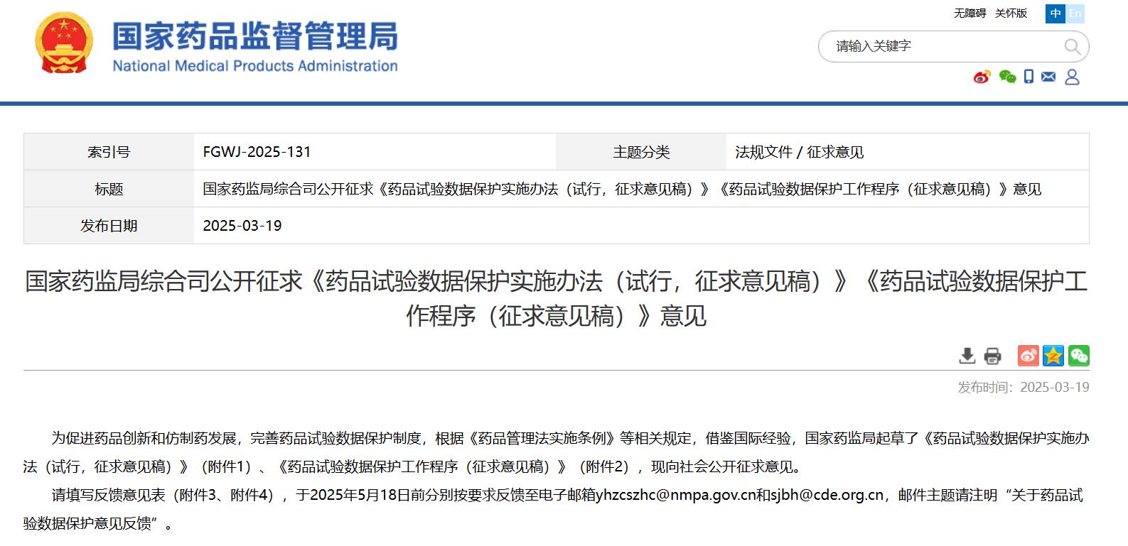 國家藥監(jiān)局綜合司公開征求《藥品試驗數(shù)據(jù)保護實施辦法(試行,征求意見稿)》《藥品試驗數(shù)據(jù)保護工作程序(征求意見稿)》意見