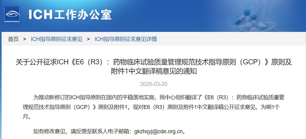 關于公開征求ICH《E6(R3):藥物臨床試驗質(zhì)量管理規(guī)范技術指導原則(GCP)》原則及附件1中文翻譯稿意見的通知