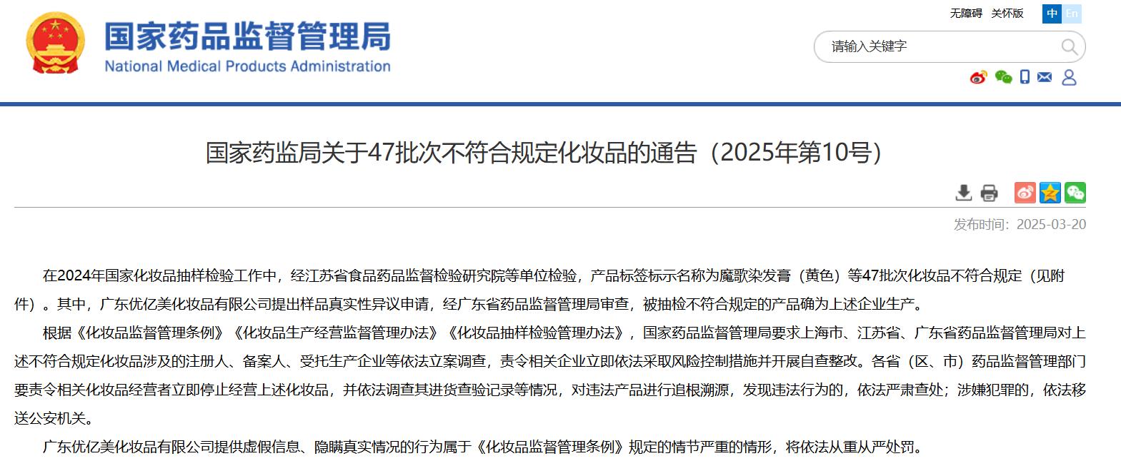 國家藥監(jiān)局關于47批次不符合規(guī)定化妝品的通告(2025年第10號)