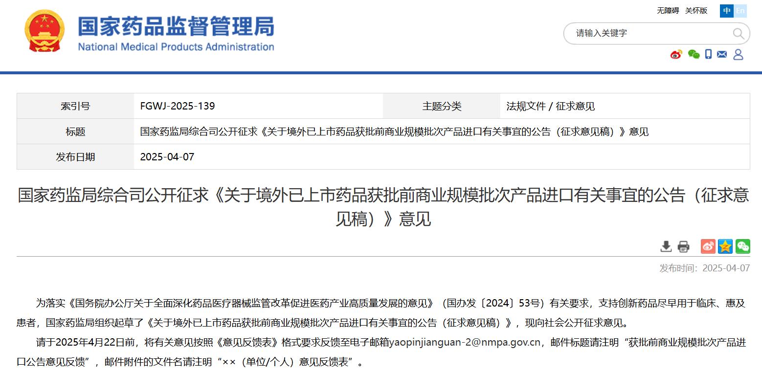 政策法規(guī) || 《關(guān)于境外已上市藥品獲批前商業(yè)規(guī)模批次產(chǎn)品進(jìn)口有關(guān)事宜的公告(征求意見(jiàn)稿)》(附法規(guī)概覽4.7-4.18)