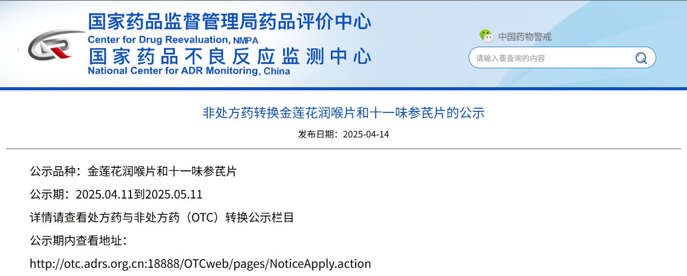 非處方藥轉(zhuǎn)換金蓮花潤(rùn)喉片和十一味參芪片的公示