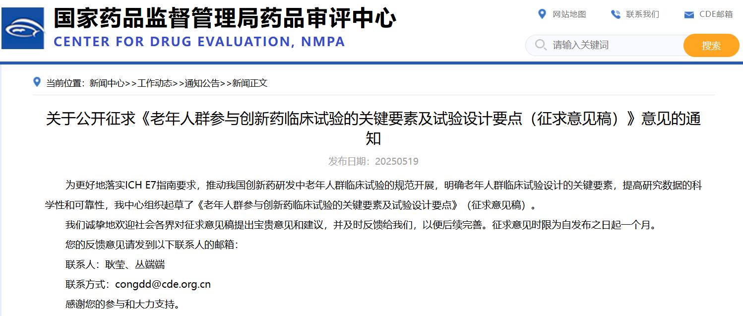 關(guān)于公開(kāi)征求《老年人群參與創(chuàng)新藥臨床試驗(yàn)的關(guān)鍵要素及試驗(yàn)設(shè)計(jì)要點(diǎn)(征求意見(jiàn)稿)》意見(jiàn)的通知