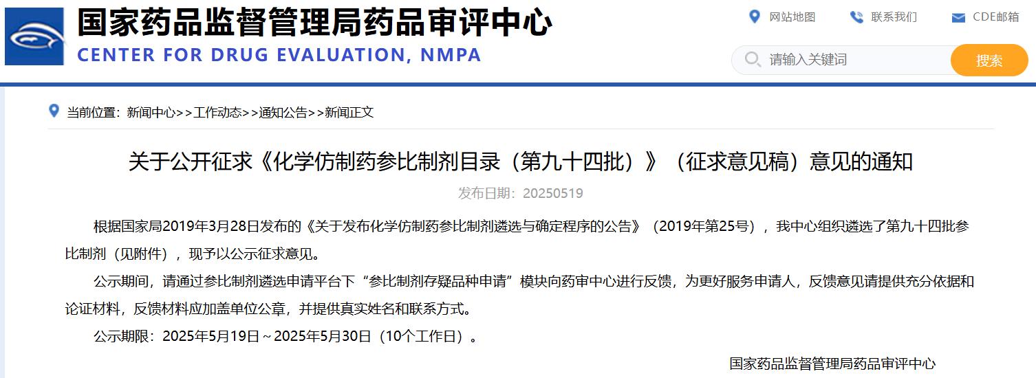 關(guān)于公開(kāi)征求《化學(xué)仿制藥參比制劑目錄(第九十四批)》(征求意見(jiàn)稿)意見(jiàn)的通知