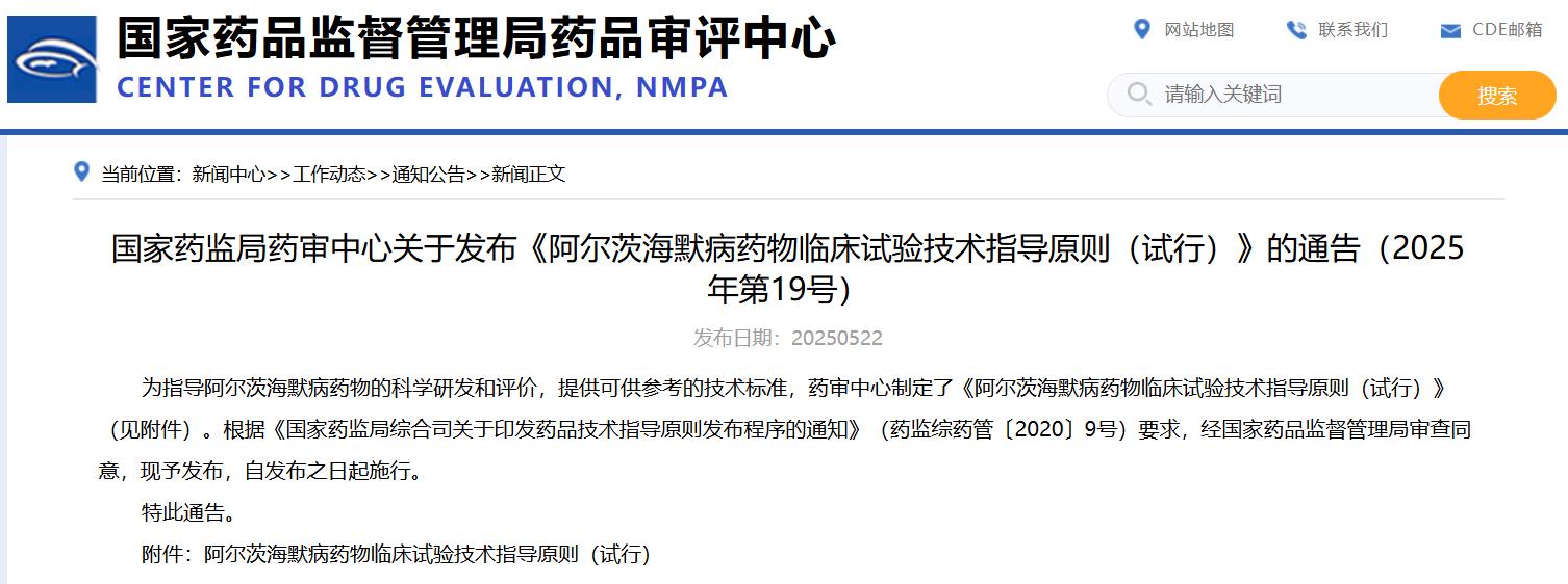 國(guó)家藥監(jiān)局藥審中心關(guān)于發(fā)布《阿爾茨海默病藥物臨床試驗(yàn)技術(shù)指導(dǎo)原則(試行)》的通告(2025年第19號(hào))
