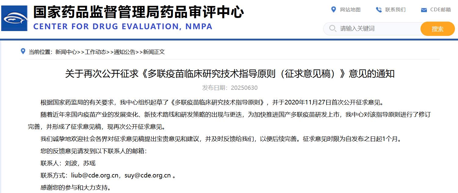 關(guān)于再次公開征求《多聯(lián)疫苗臨床研究技術(shù)指導(dǎo)原則(征求意見稿)》意見的通知