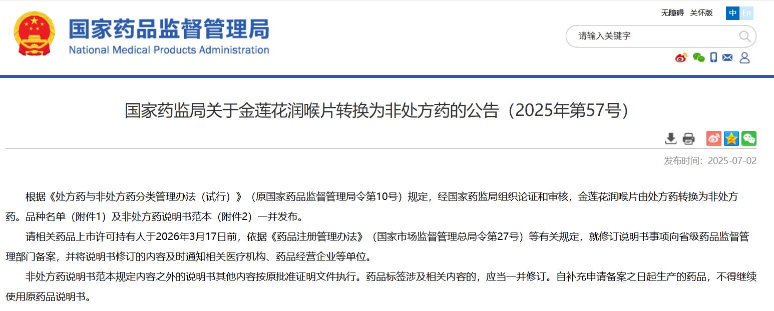 國家藥監(jiān)局關(guān)于金蓮花潤喉片轉(zhuǎn)換為非處方藥的公告(2025年第57號)