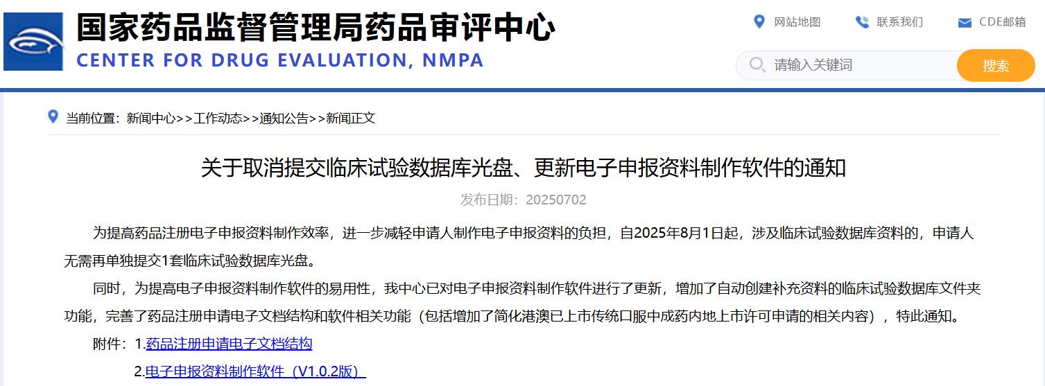 關(guān)于取消提交臨床試驗(yàn)數(shù)據(jù)庫光盤、更新電子申報資料制作軟件的通知