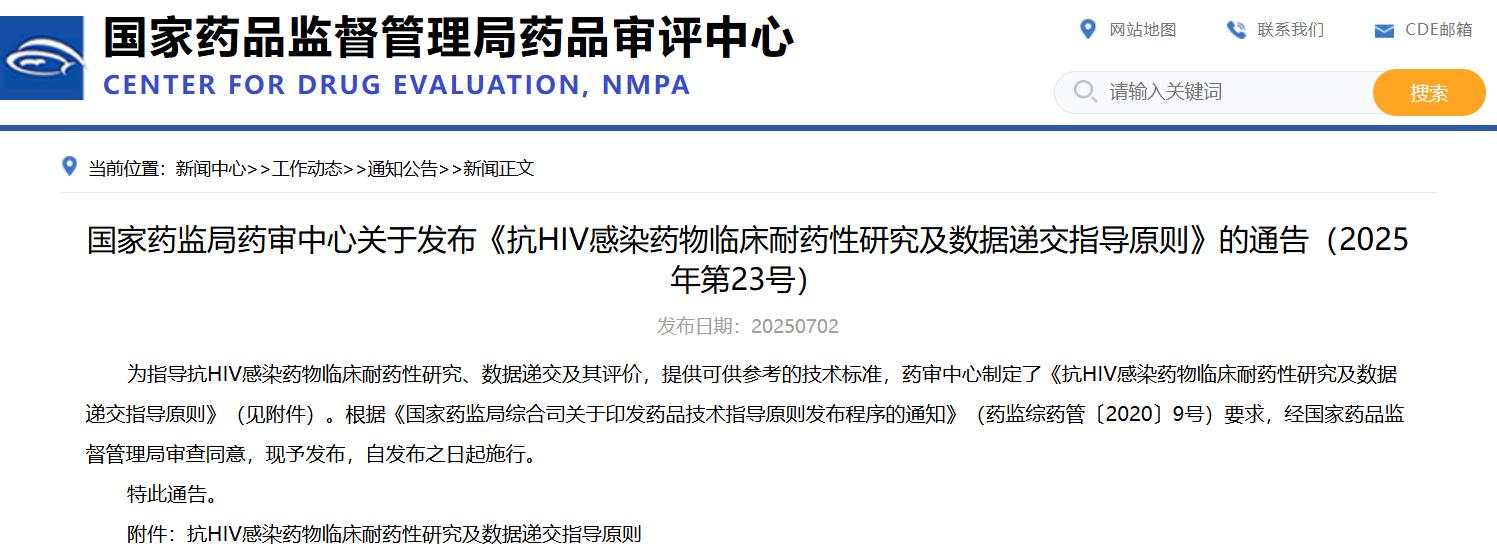 國家藥監(jiān)局藥審中心關(guān)于發(fā)布《抗HIV感染藥物臨床耐藥性研究及數(shù)據(jù)遞交指導(dǎo)原則》的通告(2025年第23號)