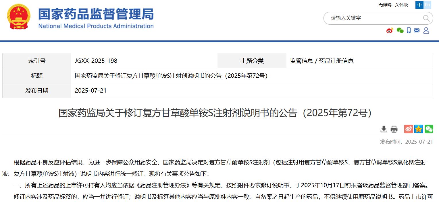 國(guó)家藥監(jiān)局關(guān)于修訂復(fù)方甘草酸單銨S注射劑說(shuō)明書(shū)的公告(2025年第72號(hào))