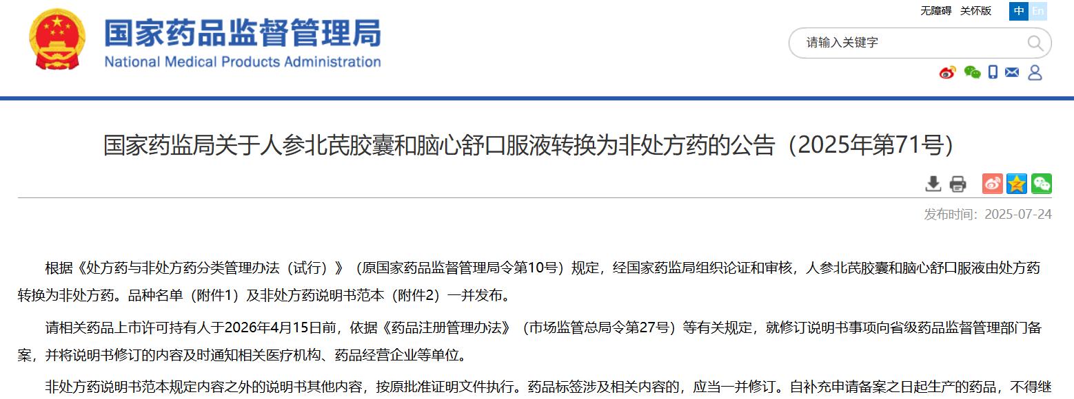 國(guó)家藥監(jiān)局關(guān)于人參北芪膠囊和腦心舒口服液轉(zhuǎn)換為非處方藥的公告(2025年第71號(hào))