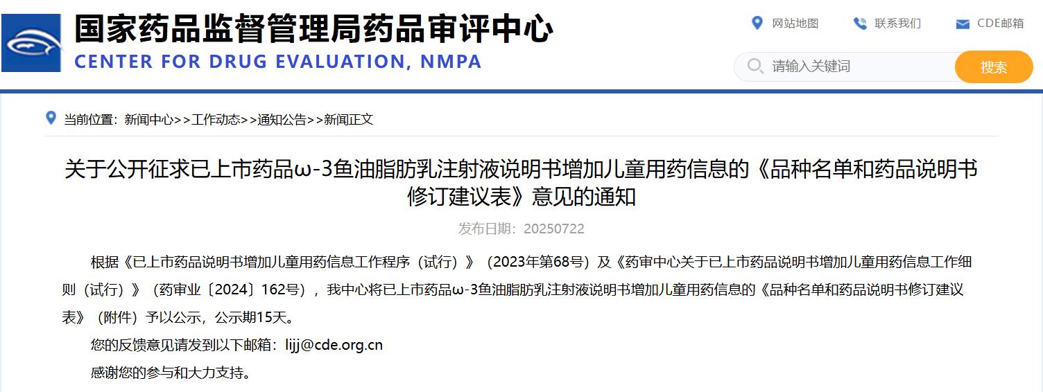 關(guān)于公開(kāi)征求已上市藥品ω-3魚(yú)油脂肪乳注射液說(shuō)明書(shū)增加兒童用藥信息的《品種名單和藥品說(shuō)明書(shū)修訂建議表》意見(jiàn)的通知