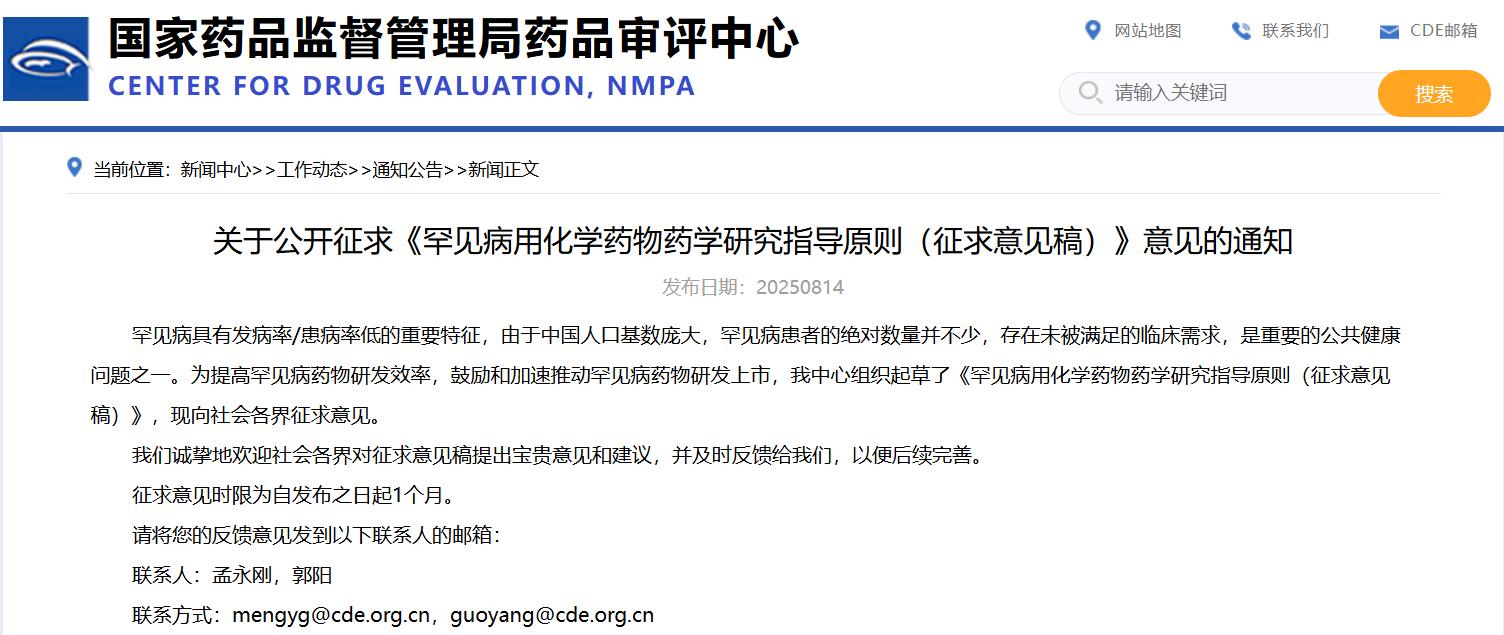 關(guān)于公開征求《罕見病用化學(xué)藥物藥學(xué)研究指導(dǎo)原則(征求意見稿)》意見的通知