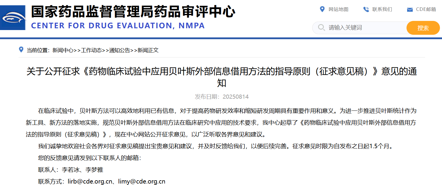 關(guān)于公開征求《藥物臨床試驗(yàn)中應(yīng)用貝葉斯外部信息借用方法的指導(dǎo)原則(征求意見稿)》意見的通知