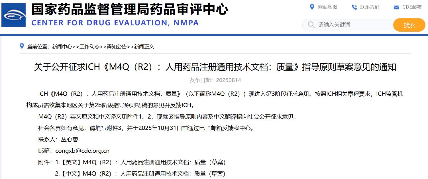 關(guān)于公開征求ICH《M4Q(R2):人用藥品注冊(cè)通用技術(shù)文檔:質(zhì)量》指導(dǎo)原則草案意見的通知