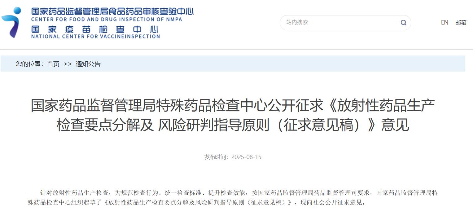 國(guó)家藥品監(jiān)督管理局特殊藥品檢查中心公開征求《放射性藥品生產(chǎn)檢查要點(diǎn)分解及 風(fēng)險(xiǎn)研判指導(dǎo)原則(征求意見稿)》意見
