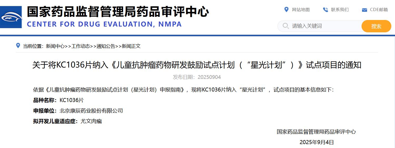 關(guān)于將KC1036片納入《兒童抗腫瘤藥物研發(fā)鼓勵試點(diǎn)計劃(“星光計劃”)》試點(diǎn)項(xiàng)目的通知
