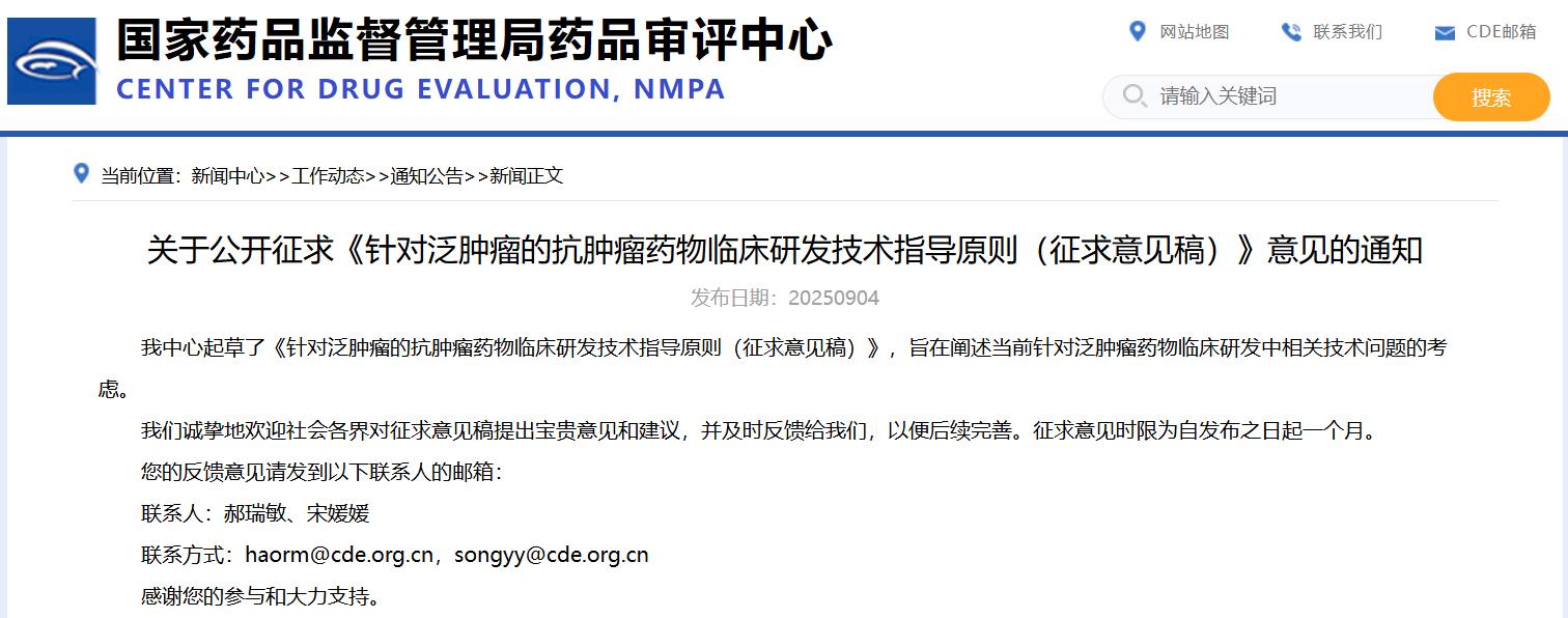 關(guān)于公開征求《針對泛腫瘤的抗腫瘤藥物臨床研發(fā)技術(shù)指導(dǎo)原則(征求意見稿)》意見的通知