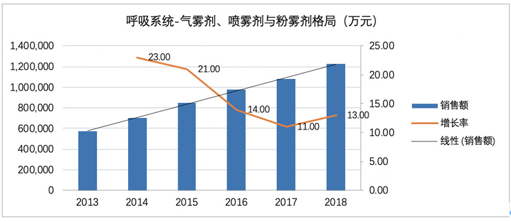 中國城市公立醫(yī)院統(tǒng)計(jì),2018年國內(nèi)氣霧劑、噴霧劑和粉霧劑市場(chǎng)容量為122億元,近5年復(fù)合增長率(GAGR)高達(dá)+16.38%。